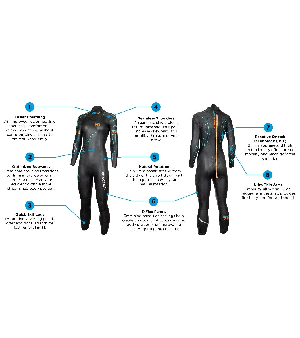 For the athlete that wants more than just an entry level suit, the Blue Seventy Women’s Reaction Fullsuit has been significantly upgraded. The suit has been re-designed with Yamamoto 38 air-cell neoprene from the chest to the knees, which improves warmth by creating pockets of air within the suit while increasing buoyancy. The Reaction also includes enlarged arm gussets, a full body low-friction coating, and a larger buoyancy panel for body positioning. Combine these features with a suit praised for its superior fit, and you have a package that is the perfect mid-range suit for someone not wanting to spend big dollars, but not wanting to settle for second best.