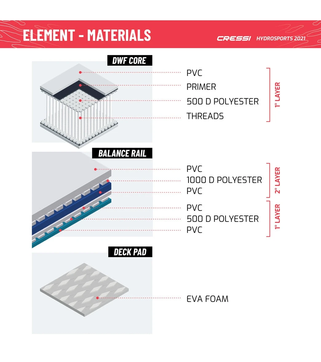 - Material(s): Cressi DWF Double Wall Fabric Element boards are made with Cressi DWF (Double Wall Fabric) technology, an airtight multilayer material whose internal fibers give it a perfectly flat and rigid surface once inflated.